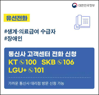 ✅ 신청 대상 : 생계 및 의료급여 수급자, 장애인 ✅ 신청 방법 : 통신사 고객센터 전화 신청 (KT - 100번, SKB - 106번, LGU+ - 101번), 가까운 통신사 대리점 방문 신청