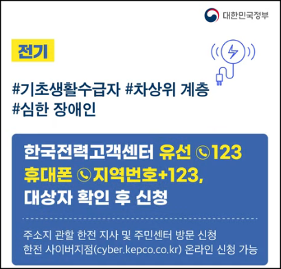 ✅ 신청 대상 : 기초생활수급자, 차상위 계층, 심한 장애인 ✅ 신청 방법 : 한국전력고객센터 (123번), 휴대폰 (지역번호+123번), 주소지 관할 한전 지사 및 주민센터 방문 신청, 한전 사이버지점 온라인 신청