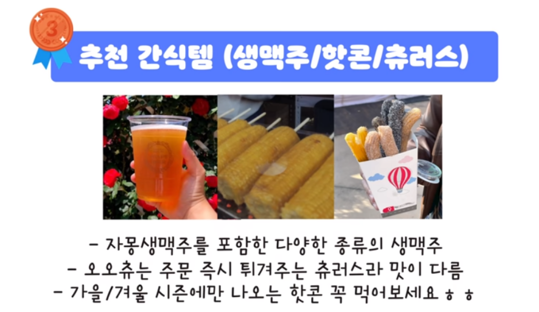 ✅ 특히 에버랜드에 파는 자몽생맥주는 들고 다니면서 시원하게 마실 수 있어서 아이들과 함께 온 부모님들에게 추천하는 간식템입니다. ✅ 그리고 오오츄라는 츄러스 전문점의 츄러스는 다양한 맛이 일품이고 주문 즉시 튀겨주는 곳이라 바삭하게 먹을 수 있다고 합니다.