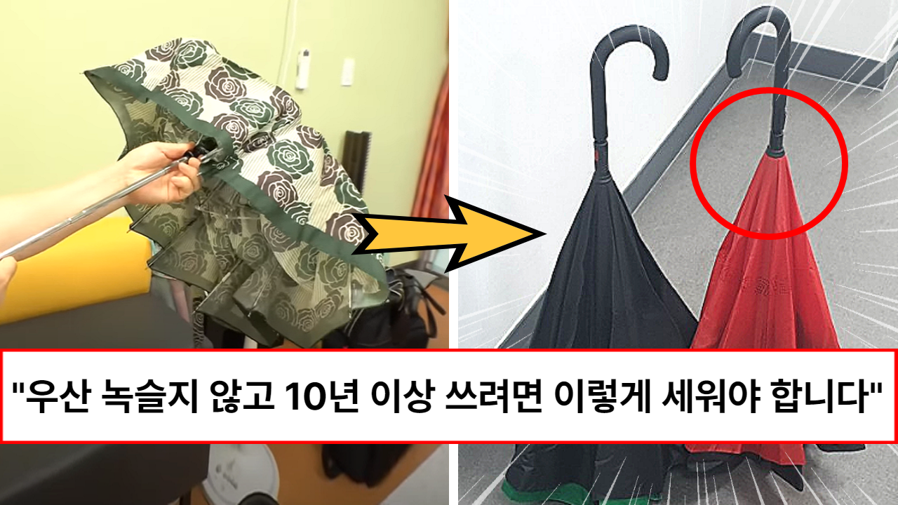 ✅ 외출하고 들어와서 우산을 잘 보관해야 녹슬지 않고 오래 쓸 수 있는데요. ✅ 거의 99% 사람들은 우산을 손잡이를 위로 오게 해서 세워둡니다. ✅ 하지만 젖은 우산을 손잡이가 위로 오게 해서 세워두면 고인 물이 우산대를 녹슬게 하고 이는 우산이 쉽게 부러지고 휘어질 수 있는 원인이 된다고 합니다. ✅ 우산은 반대로 손잡이가 아래로 오게 해서 거꾸로 세워둬야 제대로 보관하는 것이라고 합니다.