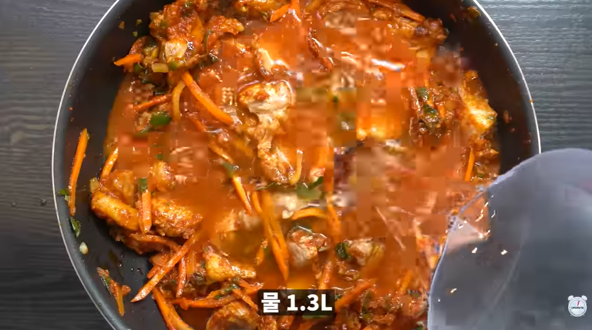 ✅ 잘 볶다가 물 1.3L를 부어줍니다.