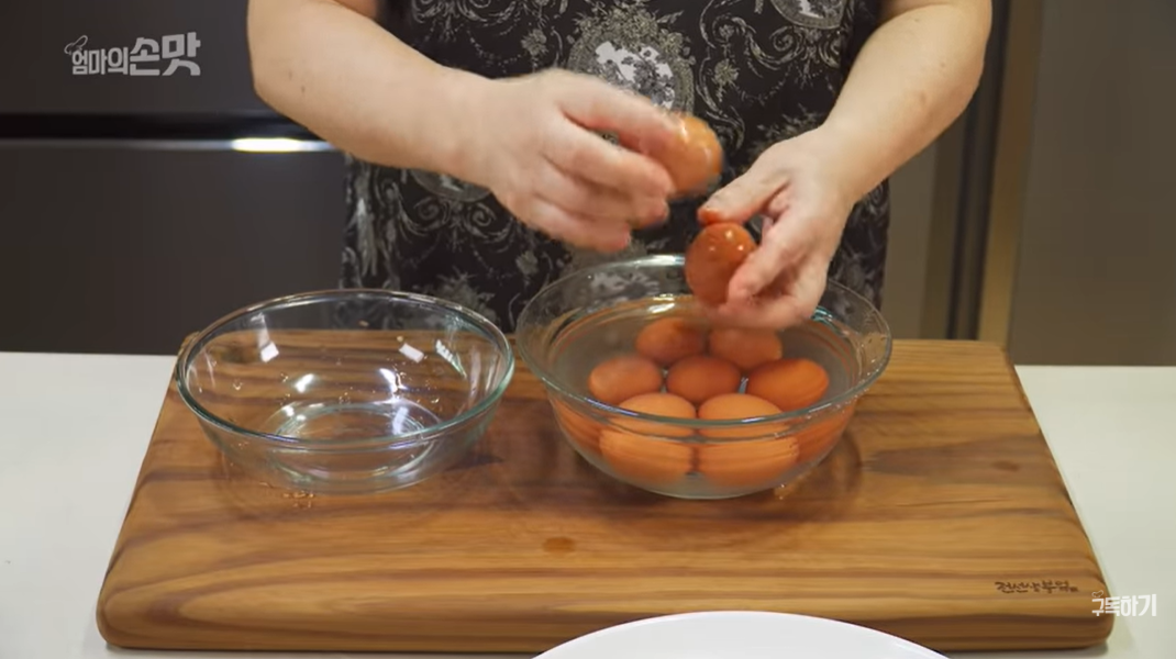 ✅ 계란 껍질이 잘 까지게 하려면 계란끼리 부딪혀서 금이 전체적으로 가게 한 다음 찬물에 잠시 담궈둡니다. ✅ 이렇게 하면 금이 간 사이로 찬물이 들어가서 계란 껍질이 훌러덩 잘 벗겨집니다.