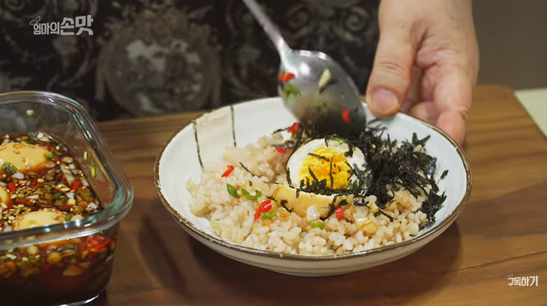 ✅ 밥에 계란장 1개를 넣고 양념장을 넣고 참기름과 김가루를 넣고 비벼먹습니다.